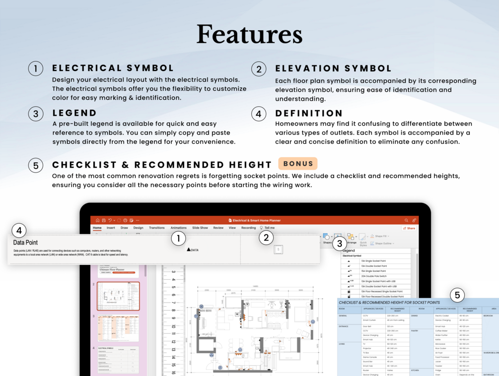 • Featuring a comprehensive checklist to help you explore all possibilities and minimize the chance of missing out socket points. Additionally, a recommended socket height guide assists you in determining the optimal height for your socket points.