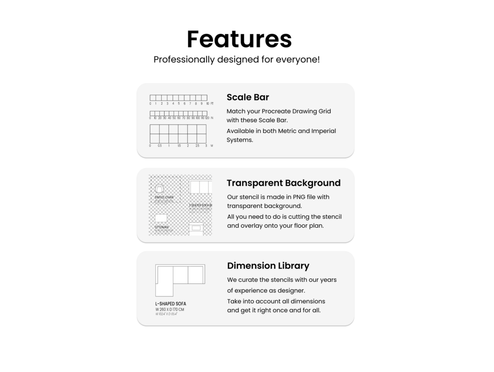 Procreate is an intuitive drawing tool available on iPad. We designed this stencil to allow you to start designing your floor plan in less than 5 mins on Procreate.