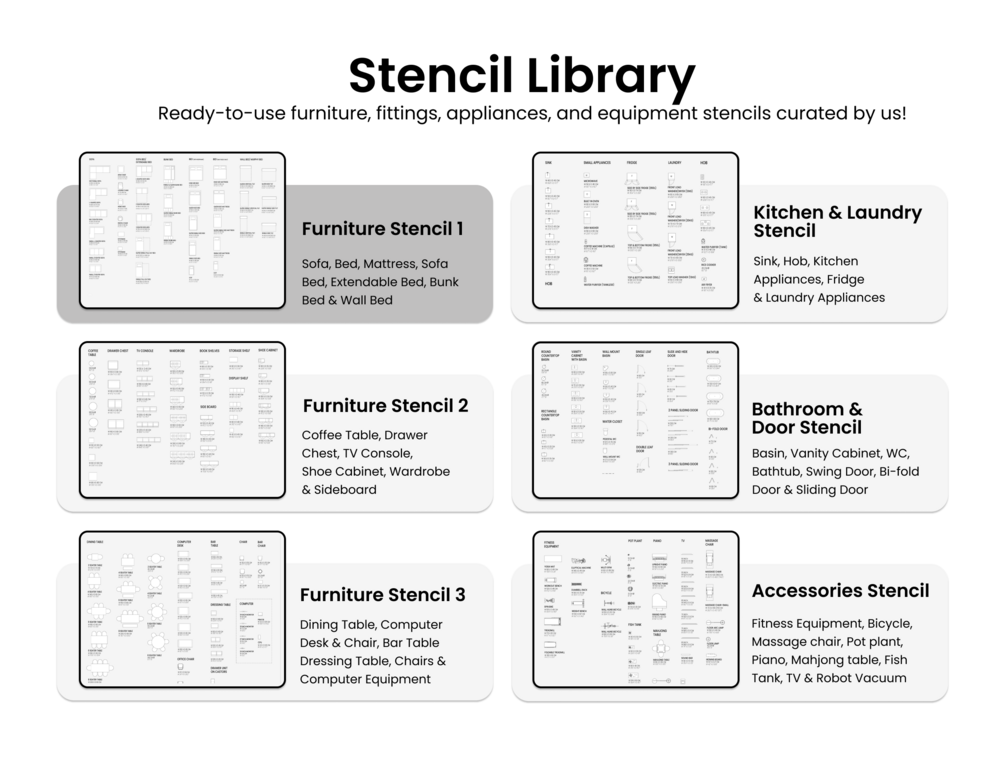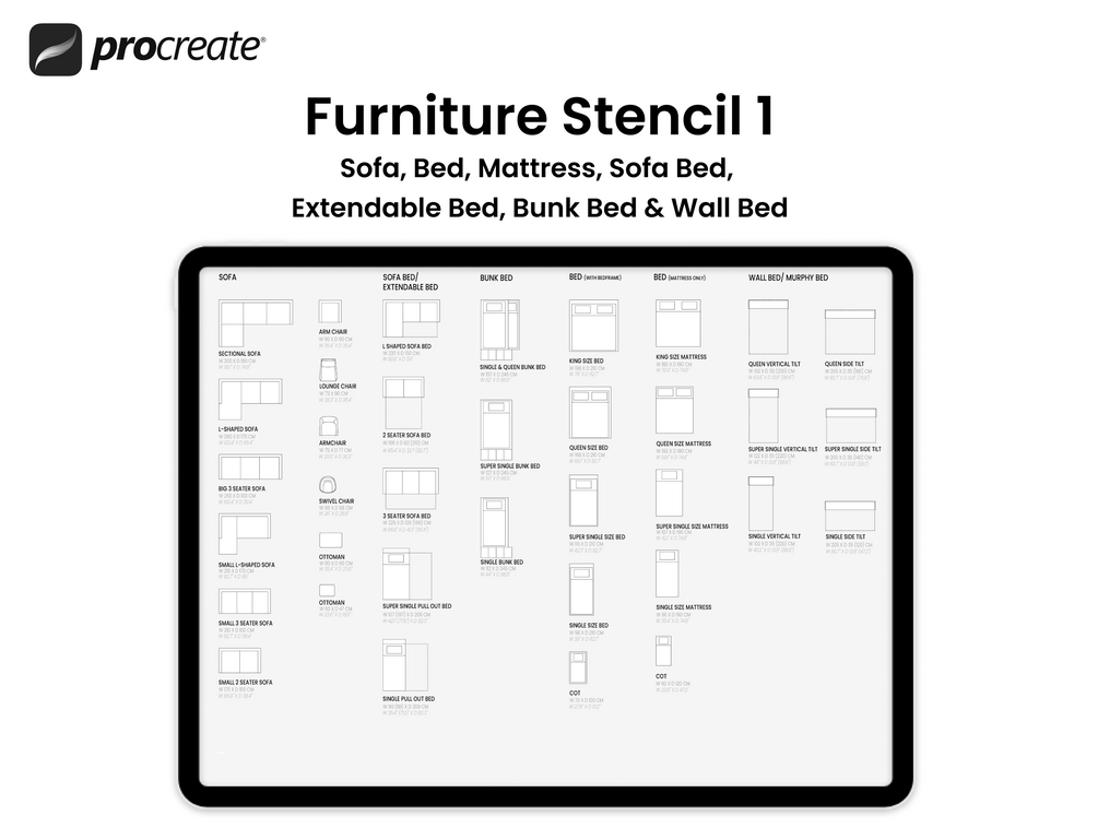 This stencil consists of Sofa, Bed, Mattress, Sofa Bed, Extendable Bed, Bunk bed & Wall bed. Furniture stencil 2 & 3 are sold separately.