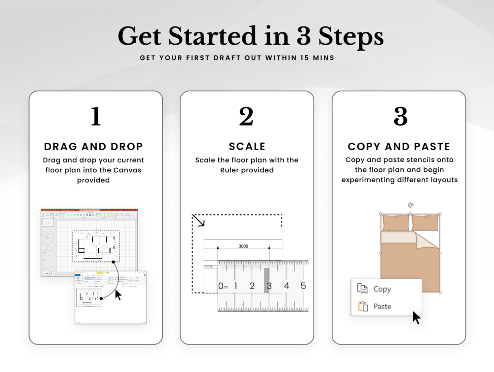 • With everything scaled to 1:100, you can size up elements easily. A movable ruler is specially designed to serve as a reference for measuring and scaling your floor plan.